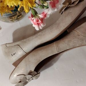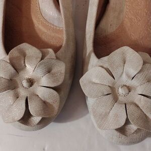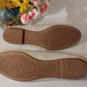 NWOT Style Emalia. These are darling, and perfect for now. Sweet twill look fabric with a subtle sparkle. Padded foot bed, comfort sole and heel. Flower embellishment on toe. Size 10 measures 3.5 wide by 11 long, 5/8 inch heel. These couldn't be more comfortable or cute, and they are NEW.