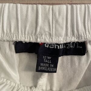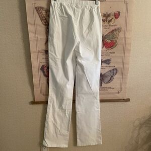 Elastic waist pull on cotton & spandex pants. No pockets straight leg. Waist is 26 inches unstretched inseam measures 32 inches.