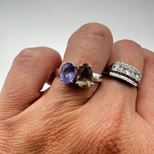 These are stunning pairing of smokey topaz and tanzanite! The pear cut smokey topaz measures about 5x8mm and the tanzanite, oval cut measures about 5x7mm. Stamped sterling silver on the inside of the shank.