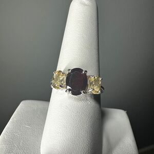 This is stunning 9x7mm oval faceted, deep red, mozambique garnet AND two accent, oval cut 4x6mm light yellow citrine on either side! Stamped sterling silver on the inside of the shank.