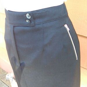 NEW Made in Russia. That's rare. Pretty wool with lots of zippers. Zippers on the left and right pockets. A zipper up the back that you can adjust. Fully lined. The waist closes with two buttons and a hidden zipper in the front. Size 10 measures 32 at waist, 42 at hips, 40 at bottom hem. 28 long from waistband to hem. A classic, and new.