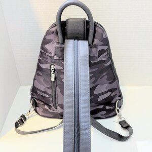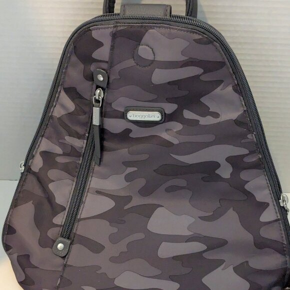 This is a NWOTs Baggillini Crossbody that can be converted to a backpack! It is Smokey Gray Camo perfect for women, men, children, anyone really! It has so much to offer! There are convenient pockets and a zipper to get into the main bag which has a zipper inside with a pouch of 2 rather large pockets. There is also a zipper outside of the bag to make getting what you need incredibly easy. It is a wonderful carryall for travel or even day to day as it is very functional and unique. This is one great bag! It measures 12 inches wide at its widestest point and 6 inches at its Shortest, it is 12 inches high and 2 1/2 inches deep. We are a small company that puts customer service and quality first. Please reach out with any questions. We ship within 1-2 days. Thank you.