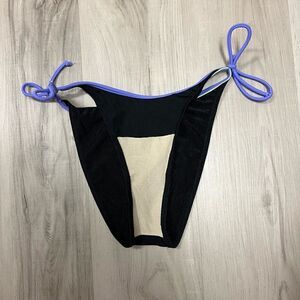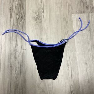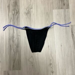 New without tags vintage 90’s bikini bottom in black with purple and neon green ties as shown. Size marked 11/12. Material composition on tag as shown. Never worn. Has been sitting in storage since purchasing. No signs of material degradation. Side ties are stitched on. Full back coverage. High cut leg. Unfortunately I do not have the matching top.