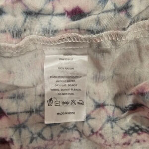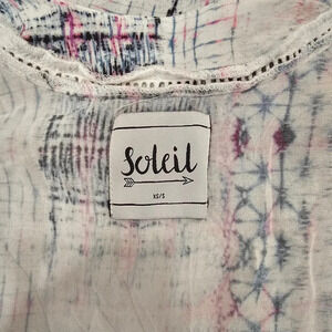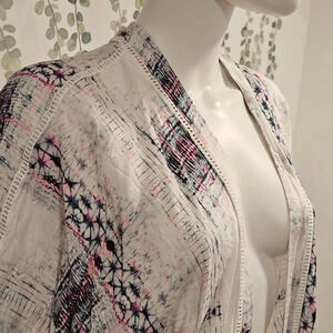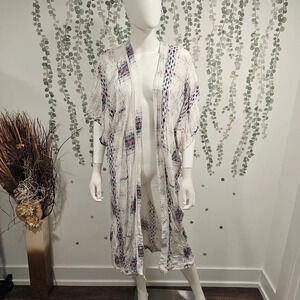 This is a new, white, long-sleeved, open-front, rayon kimono by Soleil. It features a geometric pattern in shades of pink, blue, and black. The kimono has a lace trim around the neckline and sleeves. It is made of 100% rayon and is machine washable. The kimono has a relaxed fit. It is in new condition without tags or box.