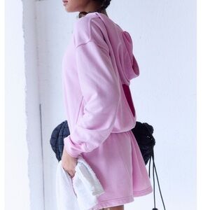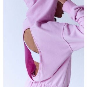 Your new go-to for to-from, this comfy romper is featured in a hooded, long-sleeve style with relaxed shorts and an unexpected open back for the perfect peek of skin. Relaxed, mini length, Comfy cotton blend, attached hood, long cuffed sleeves, elasticated waist, relaxed shorts, open back. Throw on over your favorite sports bra and bike shorts for an effortlessly cool studio-to-street moment.