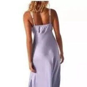 This Free People Intimately maxi slip dress in size XS features a solid purple satin fabric with lace accents and a V-neckline. The sleeveless dress has a strappy sleeve design and a pullover closure, making it easy to wear. Perfect for various occasions such as weddings, parties, or casual outings, this dress exudes a fairy-like, bohemian vibe with its long length and flowy silhouette. Ideal for the summer or spring seasons, this dress is a stylish and versatile addition to any woman's wardrobe.
