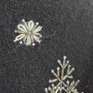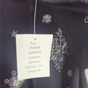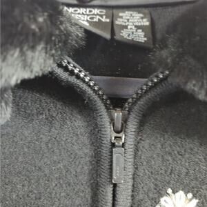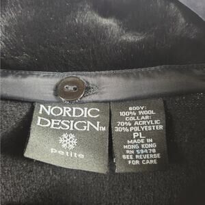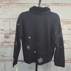 New with partial tags Nordic Design 100% Wool Sweater with faux fur collar. Black with beaded snowflakes on front and back. Full zip. Size Petite Large