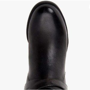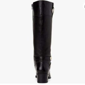 Giani Bernini's Revaa riding boots are a perfect pairing with both dressy and casual looks boasting a sleek silhouette with buckled strap details atop a chunky block heel. 1-3/4" stacked block heel Shaft height: 14-1/3"; Circumference: 14-3/4"; measured on a size 6 Round-toe riding boots with zipper closure Buckled strap details at ankle and collar Foot-molding memory foam sock with extra cushion at the heel and cushioned insole for added comfort Leather upper; manmade lining; rubber sole Brand new in original box Women's 5.5