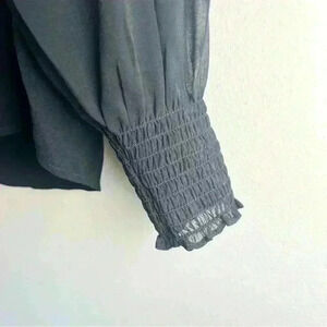 New with tags, never worn. Great condition. Smocked detail, button up blouse. Sheer arms with smocked detail at wrists and lined chest.