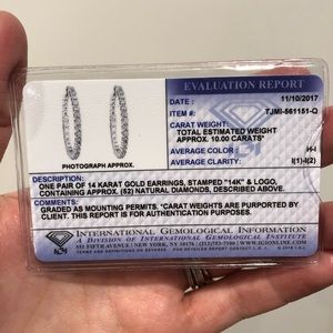 Brand new never worn. 10 carat diamond hoop earrings in 14k white gold. 2” in diameter. Certificate from the International Gemological Institute included guaranteeing authenticity.