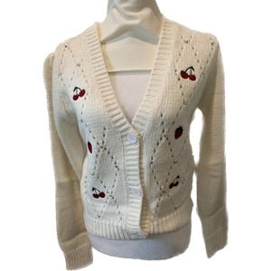 Alessandra Rich is known for creating sophisticated yet innovative designs. Showcased on this cardigan from the AW22 collection, the garment features pointelle knit detailing and an intarsia-knit design depicting cherries and strawberries.
