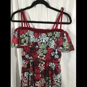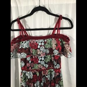 - Joined double spaghetti straps with bow detail at meeting point - Short flutter sleeves with shoulder cut outs - Ruffle detail across bust - Velvet trimming across waist - Fit and flare construction - Multi-color rosette embroidered design all over - Imported