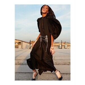 This black Gucci cape-sleeve open front crystal-embellished belted gown is expertly crafted in Italy from a silk blend, featuring a high neck with front keyhole cutout and a single button fastening, structured epaulettes with a ruffle trim, gathered sleeves with cape detailing, a pleated bodice and fine-pleated panels at the skirt. Its finished with a tulle-trimmed back panel with sequin-embellished Robe du soir pour le jour and a detachable crystal-embellished silver-tone metal belt with GG logo and lobster-clasp fastening.