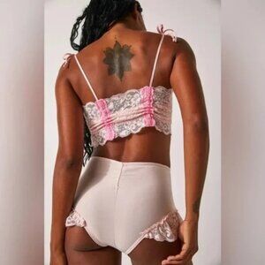 So sweet set featured in a soft knit fabrication and lace-adorned design with a bandeau-inspired top and matching bloomer bottoms.