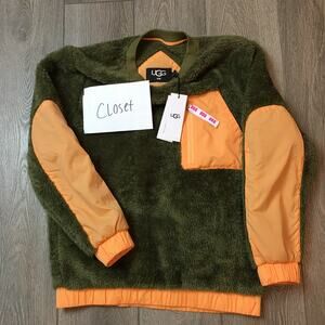 NWT $128 UGG Niko Women Sherpa Crewneck Pullover Olive Green/Orange Sz XS