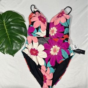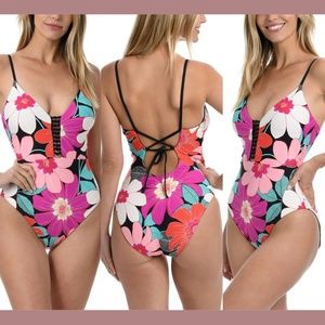 NWT $130 La Blanca [ 10 ] Bloom Reversible One-Piece Swimsuit in Black/Pink