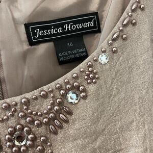 Elevate your occasionwear with this elegant 2-piece Jessica Howard dress and jacket set. Perfect for weddings, formal events, or church, this shimmering taupe ensemble features delicate pearl and rhinestone embellishments for a classy, polished look. New with tags!