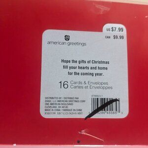 New in sealed box, set of 16 Christmas cards and envelopes, by American Greetings. This attractive set of holiday cards features a horizontal design of a holiday scene with a decorated tree, fireplace with wreath and garland, and wrapped presents under the tree, with greeting on the front and inside the Xmas cards as shown in the photos, and white envelopes. Brand new, sealed box of 16 cards and envelopes, with cards measuring approx 7" in length x 4.75" tall. A perfect set for sending holiday wishes to loved ones this season!