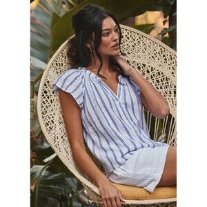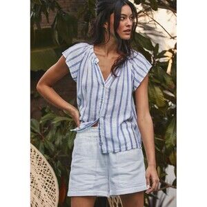 Effortlessly chic, the Rails Alena Linen blend top in a striking blue Villa stripe is the embodiment of breezy coastal style. With its lightweight fabric, relaxed fit, and comfortable V-neck, this top is perfect for those seeking a blend of comfort and style. Whether you're headed to the beach or a casual gathering, its short puff sleeves and timeless striped pattern will make it a go-to in your wardrobe. Tailored for a regular size XXS, this button-up piece is versatile for a variety of occasions, from a laid-back day out to a cocktail party. It's machine washable for easy care, ensuring that this bohemian-inspired top remains a staple in your collection through spring and summer.