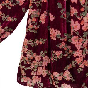 Description: A big girl's romantic baby doll dress in an all-over floral print burnout pleated velvet with a ruched center bodice and puff, banded sleeves.