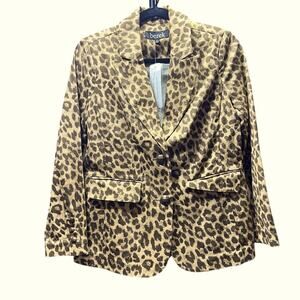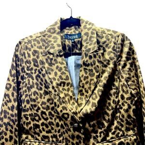 Stylish leopard print blazer by Berek. Features a bold animal pattern in brown and tan.