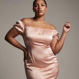 It comes with off-the-shoulder sleeves and subtle scallop-trim details along the neckline and hem. Plus, it's crafted from our textured satin, which has a natural crinkle that makes it perfect for packing.