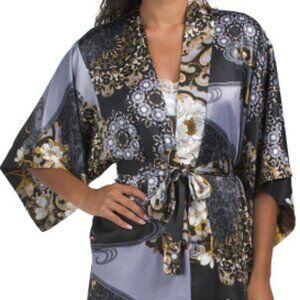 NWT $185 NATORI Imperial Lotus Floral Satin Robe Gray Boho Luxe Holiday Gift XL