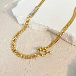 Elegant Gold Herringbone Flat Chain Chocker Necklace With Cubic Zirconia & Cuban Chain Links Featuring Toggle Clasp