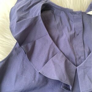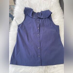 Elegant navy blouse with ruffled neckline. Sleeveless design. Perfect for casual or formal wear. buttons down the back