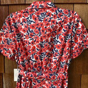 Brand new with tags and never worn! Red and Blue Floral Print 1901 Short Sleeve Shirt Dress in Women's X-Large - Figure flattering Fit & Flare Silhouette, adds a pop of color to your wardrobe with this beautiful 1901 shirt dress. Features a vibrant red floral pattern that is perfect for any spring occasion, whether it's a wedding, party, or casual outing. The dress has short sleeves, a collared neckline, and buttons completely open. Matching belt included.