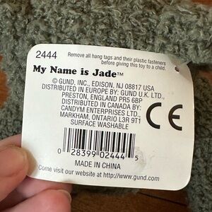This is a vintage GUND “Jade” teddy bear, style #2444, in a rare olive-green boucle fur. Features a charming floral ribbon bow, classic GUND craftsmanship, and adjustable arms and legs for posing. Perfect for collectors, nursery décor, or as a nostalgic gift. Comes with original “Gotta Getta GUND” hang tag and sewn-in tags.