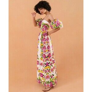 NWT. $1K BORGO DE NOR Pink Juliet Floral Print Off-shoulder Dress SZ 12 white