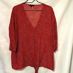 NWT 1.STATE WO SIZE 3X PEASANT TOP FRONT TIE AT HEM RED WITH SMALL FLORAL PRINT