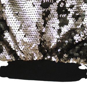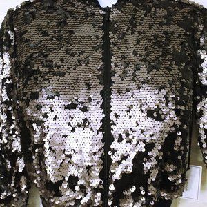 Vintage Y2K New With Tags (NWT) Outerwear Evening Wear Cocktail Formal Special Occasion, 1 State made in China MSRP $159 Dramatic Pause color 240 Lustre Nude, Metallic flip Sequins in bronze and Black, Top Bomber Jacket, Ladies size XS(2/4/6) , fully lined, relaxed fit with ringer ribbed elastic cuff waistband collar, hand wash/dry clean, sequined sparkly shimmery glam bling in bright shiny metallic shades of bronze/silver with black. In excellent pre-owned* New With Tags (NWT) condition with no outwardly visible flaws - clean, no damage - see pics. 2023 Runway On Trend Upcycle Repurpose Evening Street Chic Glam Rock Motown MCM Retro Sparkle Embellished