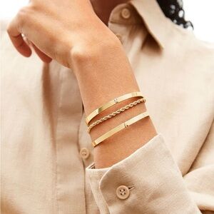 Chic gold bangles with letter accents. Ideal for stylish layering.