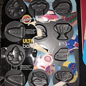 NEW WITH TAGS - Red Cookie Pop Pan missing tag - all others have tags - NORDIC WARE Cake Pop pans - WILTON Cars, Planes, Rockets Cakelet or Cookies Pan Plus Cupcake or Cake Pop decor and EXTRA Cake POP Sticks