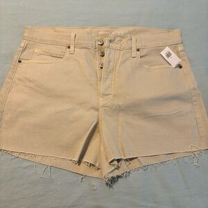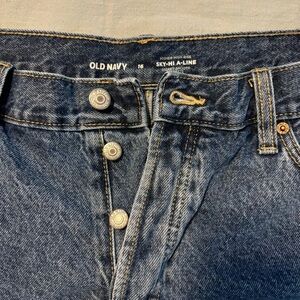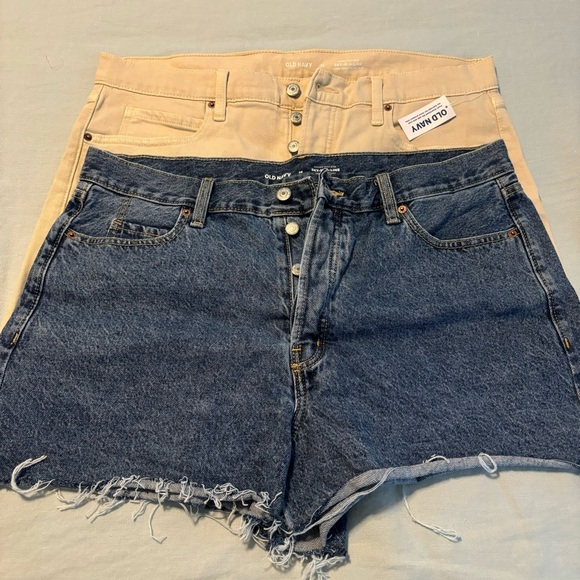 NWT Old Navy Higher High-Waisted Button-Fly Sky-Hi A-Line Cut-Off Non-Stretch Jean Shorts. Button front. Belt loops. Hidden button fly. Front scoop pockets. Back patch pockets. Cut-off hem with 3-inch inseam. Colors are called Ecru and Sonny. Both are new - Ecru has tags, Sonny does not. I took the tag off the blue denim pair and washed them with the intention of wearing them, but I realized I needed a longer inseam. My loss is your gain!