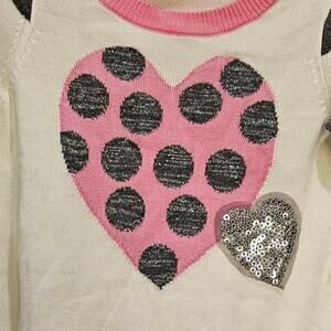 Sweater dress featuring striped sleeves and polka-dot heart.