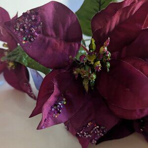 Lovely, 2 NWT deep red floral bushes of poinsettias, Michael's Ashland brand, Christmas collection. This pretty holiday floral bundle of 2 bouquets of poinsettas feature sparkly iridescent beads on the petals and stamen. These winter holiday-themed flowers measure approx 17" tall including stems, and are new with tags. One flower is detached from a bunch but included. They make a great Xmas holiday decorative accent for vases, displays, or add to wreaths and garlands for cozy holiday elegance!