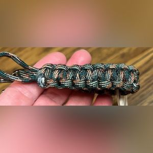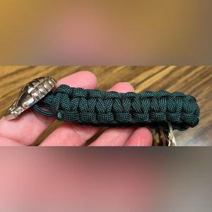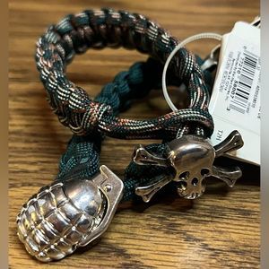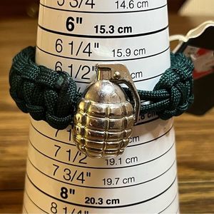 Neither has a brand or price tag but the tags are the same-same company. Solid green has a silver tone keg with a button hole type clasp, the multicolor the same but it’s a skull with crossbones. Both are 6/8” wide, multicolor is thicker.