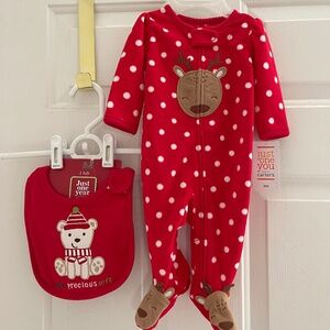 New 2 pieces - Carter’s Just One You fleece footed reindeer sleeper pajamas and Bib