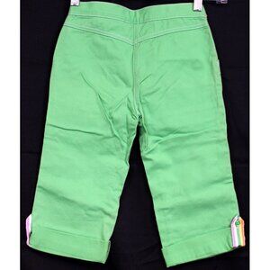 Green brushed cotton capri pants, rhinestone watermelon and ribbon faux belt and side button straps