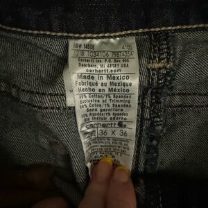 These Carhartt blue jeans offer a classic look with their premium denim construction and gold contrast stitching. The high-quality fabric ensures durability and comfort, making them perfect for everyday wear.