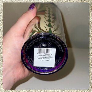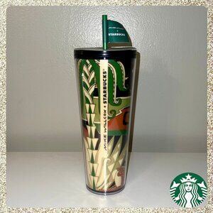 "Jungle Motif" Venti (24oz) Cold Cup Tumbler that features wildlife from different parts of Asia in a rich palette of navy, rust and jade green.