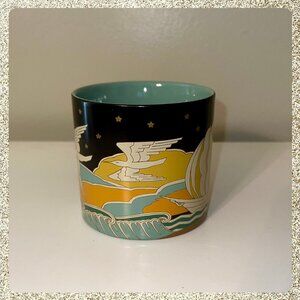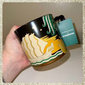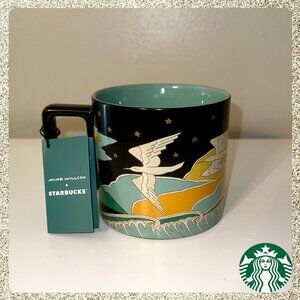 Gorgeous New Collaboration with Mike Willcox (renowned "Art Deco" artist) featuring this: 2025 Starbucks x Mike Willcox "Island Motif" 14oz Ceramic Mug that takes you on a voyage of discovery as an ancient ship sets sail from a South American paradise under an inky black sky full of stars that seem to almost twinkle.