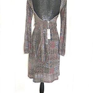 Wool and nylon gray tone Aztec print dress with a low back and wrap tie.