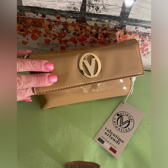 Front flap with magnetic button closure, Valentino, Orlandi Crossbody purse for women features a classic fashion style,with Sparkly diamond accented gold logo on front of Bag , The Crossbody strap gold chain is interlaced with leather like a Chanel bag which really makes Stunning .. This bag Adds a touch of glamour to your evening outfit.