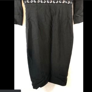 Modern utilitarianism meets timeless elegance in this stunning sheath dress featuring a plunging V-neckline trimmed with polished grommet hardware.
