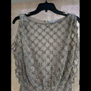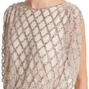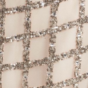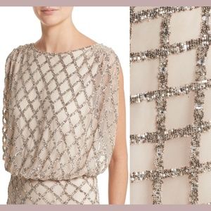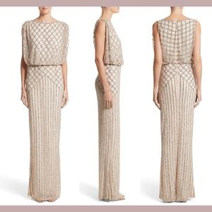 Glittering bugle and seed beads trace a glamorous lattice motif down the fluid length of a softly bloused column gown.