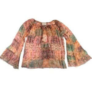 Elevate your wardrobe with this stunning Johnny Was sheer silk tunic blouse. The patchwork floral design is perfect for adding a bohemian and colorful touch to your outfit. The bell sleeves and tasseled accents give off a hippie and peasant vibe, while the multicolor pattern brings a touch of the 60s and 70s. This blouse is suitable for travel, party/cocktail, and casual occasions.